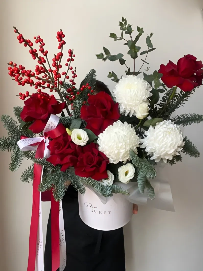 Состав: розы — 3 шт, хризантемы — 2, илекс — 1 шт, нобилис, эвкалипт.