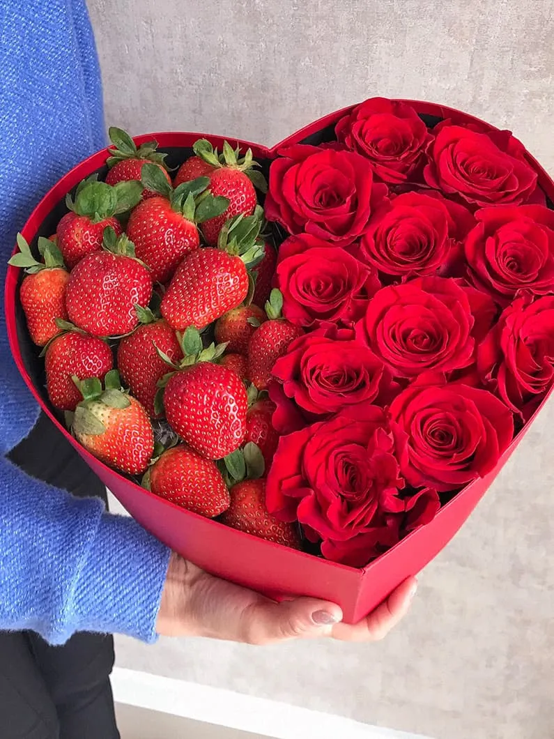 Сердце из клубники и роз выразит не только любовь, но и украсит праздничный стол. Композиция из ярких, свежих цветов и спелых, сладких ягод клубники приятно удивит и обрадует виновника торжества и гостей праздника. Букет запомнится надолго своей неординарностью и красотой, сладким вкусом лета и ароматом цветов.