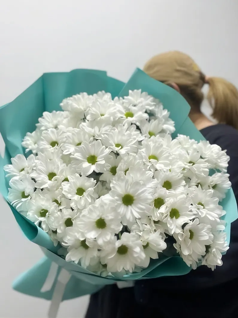 Venus" bouquet consists of a lush bunch of white chrysanthemums. Flowers are often given if you want to emphasize the truthfulness and sincerity of feelings. A wonderful way to show sympathy and respect. Inflorescences denote honor, dignity and strong relations between people. The floral composition is complemented by a delicate, laconic design.