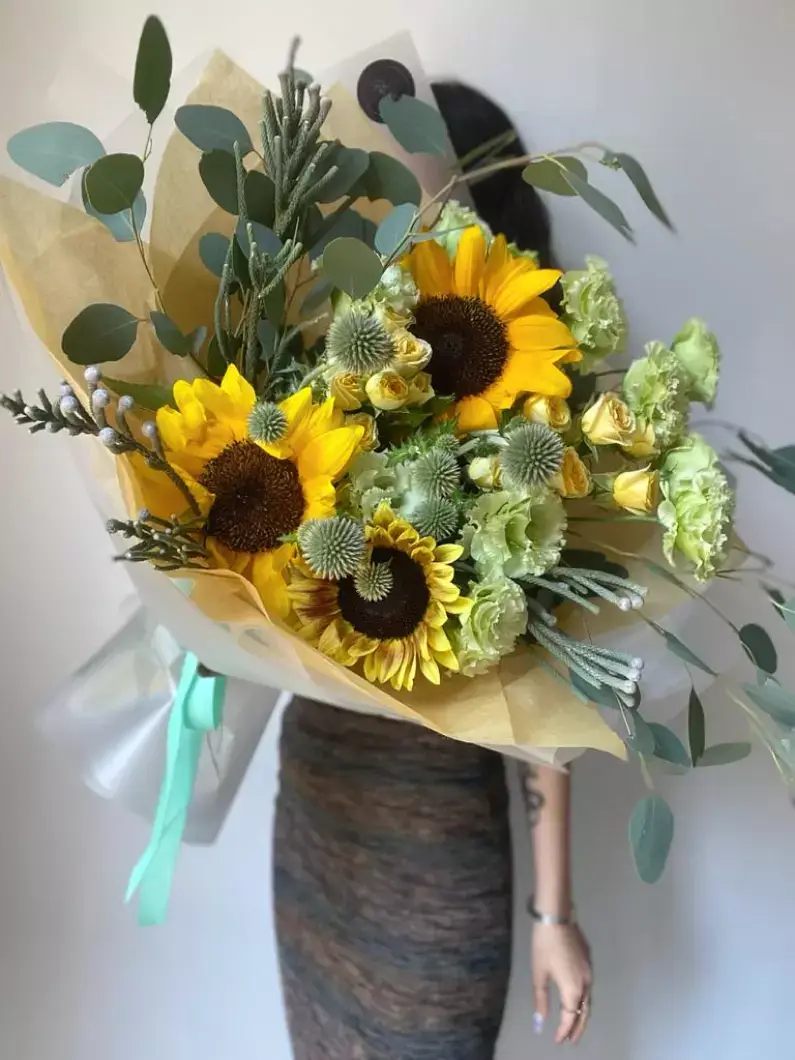 Состав: подсолнухи — 1 шт, спрей розы — 2 шт, лизиантусы — 3 шт, эрингиумы, эвкалипт, декор.