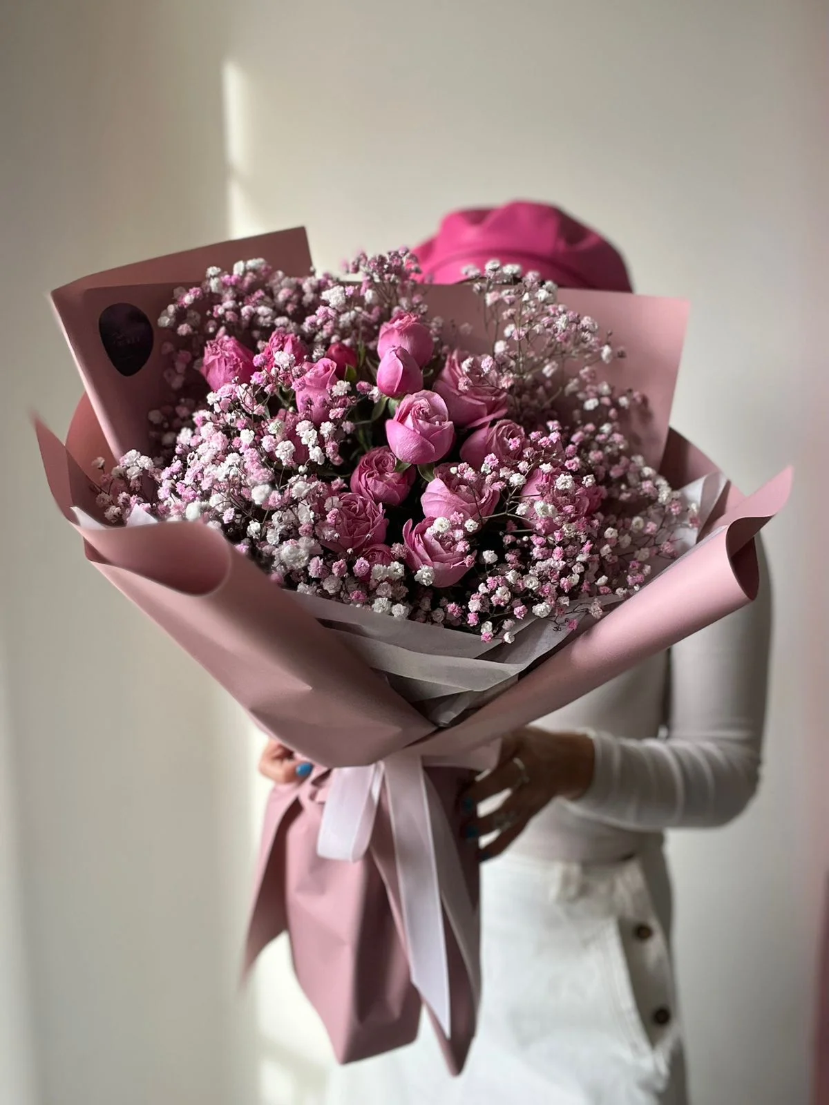 Состав: гипсофилы — 6 веток, спрей розы — 4 ветки.